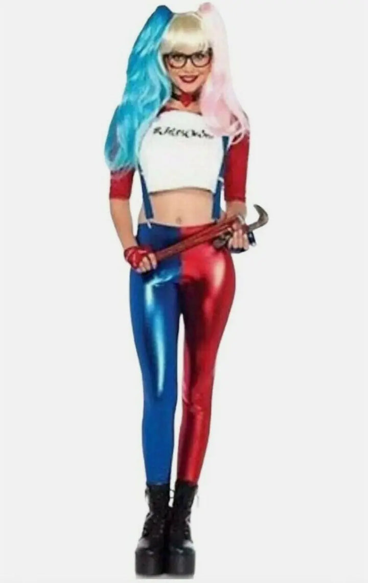 Unleash your inner anti-hero with the Kind Vibe Women's Harley Quinn Costume Set! This bold Halloween outfit features a vibrant red and blue satin bomber jacket, matching shorts, and leggings, inspired by Harley Quinn's iconic look in Suicide Squad. Perfect for cosplay, Halloween parties, or themed events, this set combines edgy style with comfort for a head-turning appearance.